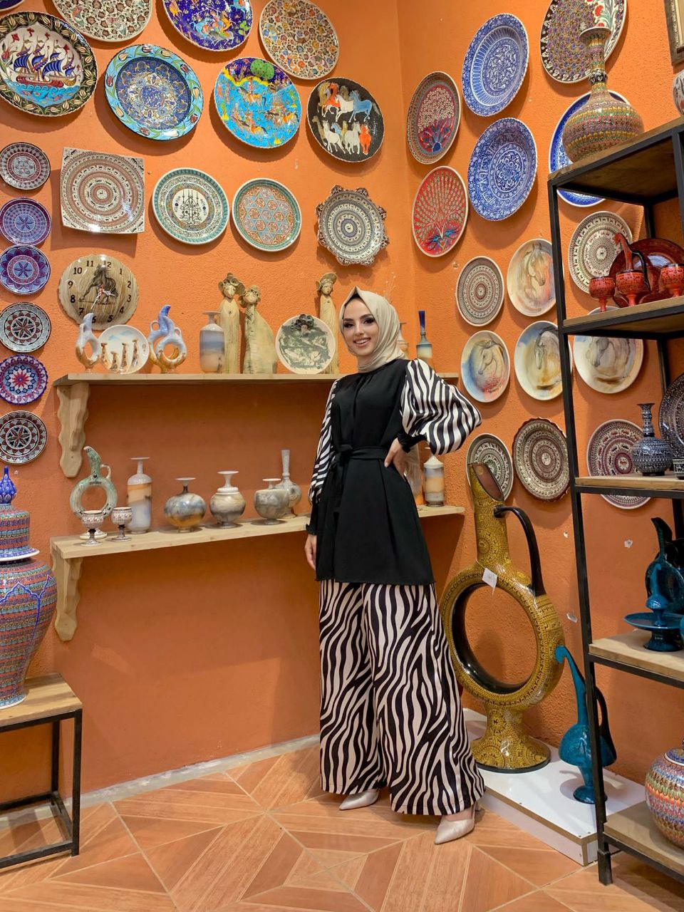 طقم تونيك بأكمام وبنطلون بنقشة الفهد (أسود) 8392