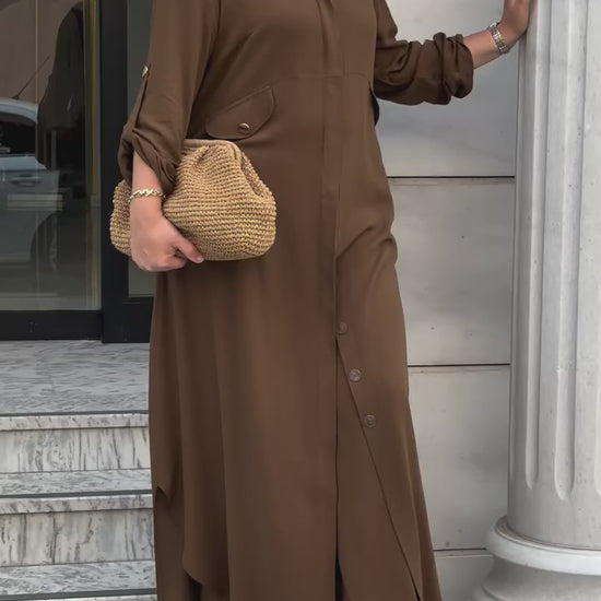 طقم هلا الشرعي مزين بجيوب وازرار مخفية لون (بني )