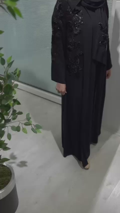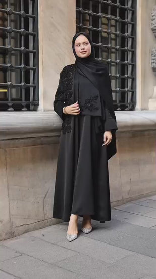 Huzurlu Resmi İşlemeli 3 Parçalı Abaya Takımı (Siyah)